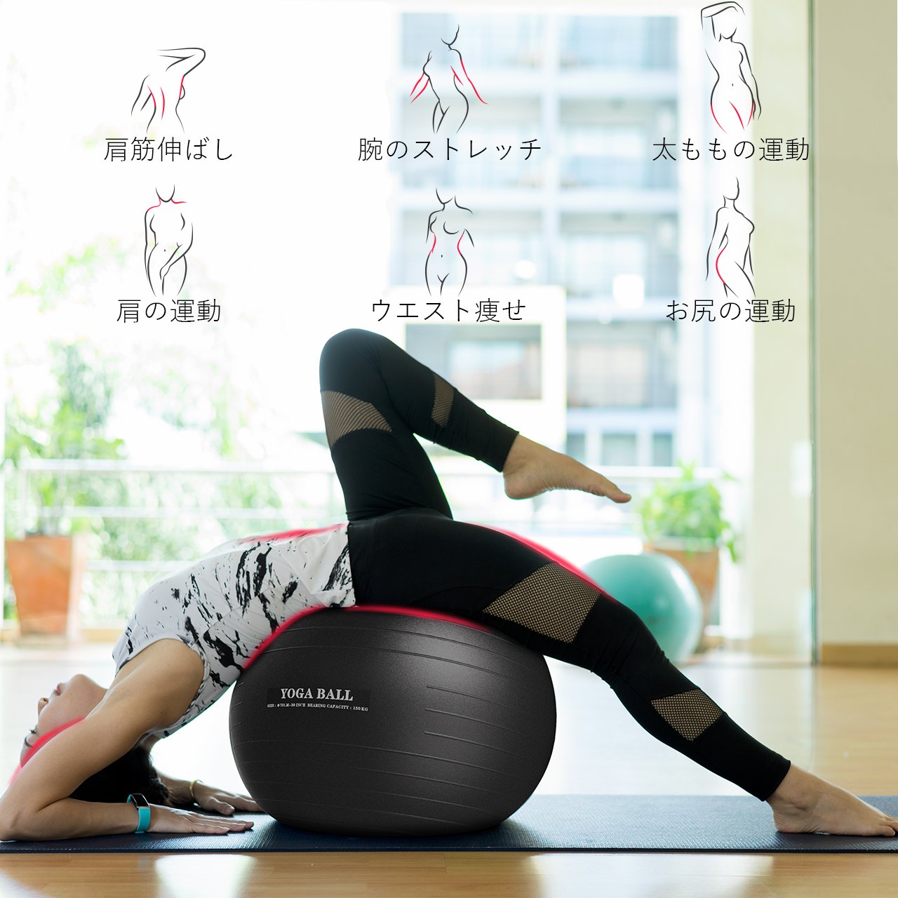 紫玉ねぎみたいなユニークなカラーのバランスボールです。表面に水波紋もついていて滑り止め効果になっています。55センチのバランスボールの他に、ピラティス用にミニサイズのボールも付いていますよ。バランスボールの大小2個セットでこのプライスはなんとなくお得感がありますね!耐荷重は150キログラムなので太めの方でも問題ありません。もちろんアンチバースト加工もされています。