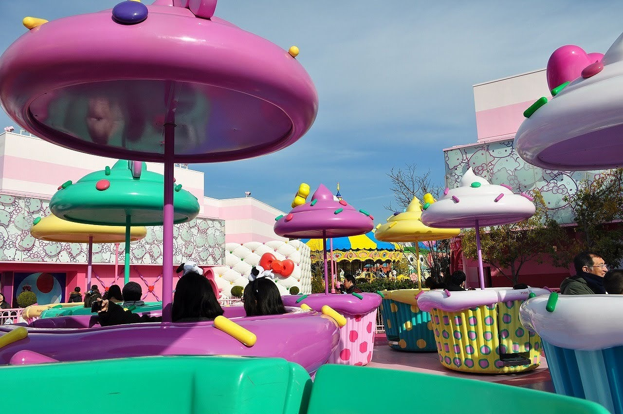 ハローキティのケーキ・パーティにご招待というストーリーです。色とりどりに並んでいるカップケーキから、好きなカップケーキを選んで乗り、音楽に乗って、クルックルッとカップが回転します。ハンドルを回せば、もっと楽しくなります。